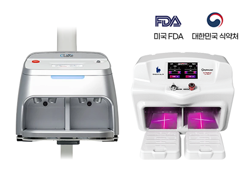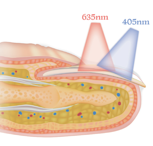 405nm, 635nm의 듀얼 파장을 이용한 병변 부위 타겟팅이 가능한 교차 빔을 만들어 감염된 손, 발톱에 조사가 가능하며 통증과 주변 조직 손상 거의 없이 치료 가능합니다.